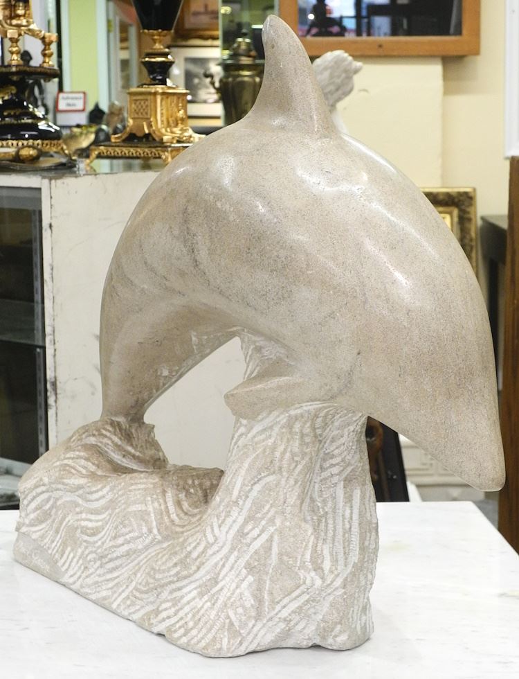 LOT 202 Marble Sculpture signed Derek Green, 19 x 22 x 5 1/2", "Leaping Dolphin". Estimate: $100 - $150 Sold For: $180 Auction Date: Tuesday, November 21 2023 at 4:00 PM