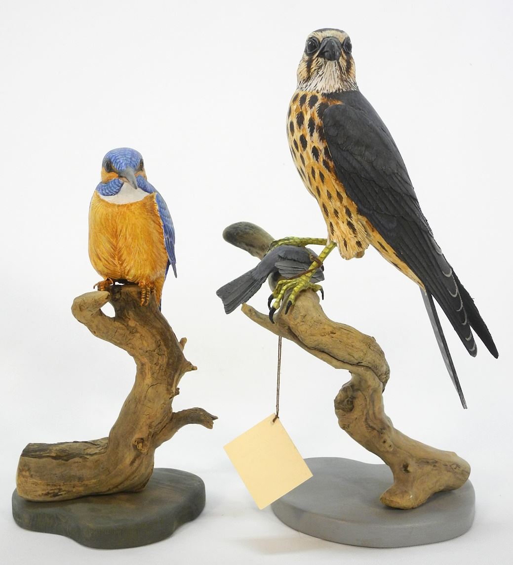 2 Bird Carvings by Shirley MacLean: Merlin & American Kershel, 12" & 14 1/2"H.