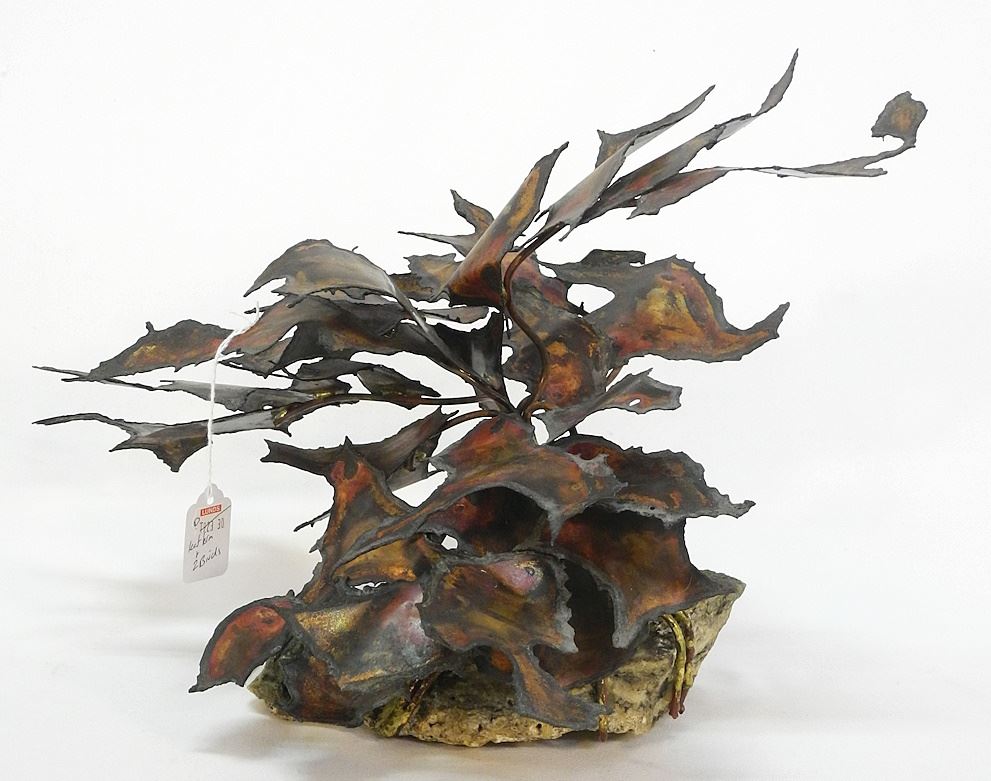 LOT 123 3 Brass Sculptures: Leaf Formation (9 5/8"H) & 2 Michael Hewitt Birds. Estimate: $80 - $100 Sold For: $20 Auction Date: Tuesday, April 23 2024 at 4:00 PM