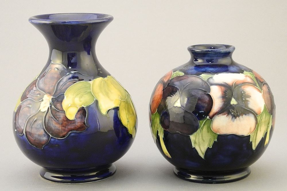 2 Moorcroft Vases: Pansy (4 1/8"H) & Clematis (5 1/8"H).