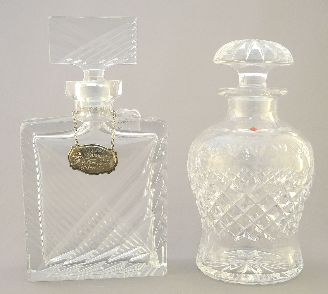 LOT 208 2 Crystal Decanters, 1 with Plated Label, 10 1/8" & 9 1/4". Estimate: $50 - $100 Auction Date: Tuesday, April 23 2024 at 4:00 PM
