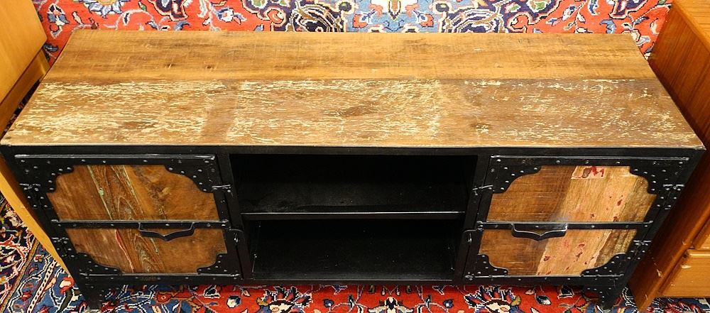 LOT 124 Metal Mounted Natural Timber Credenza, 25 1/2" x 59" x 18 1/2". Estimate: $200 - $300 Sold For: $225 Auction Date: Tuesday, April 23 2024 at 4:00 PM