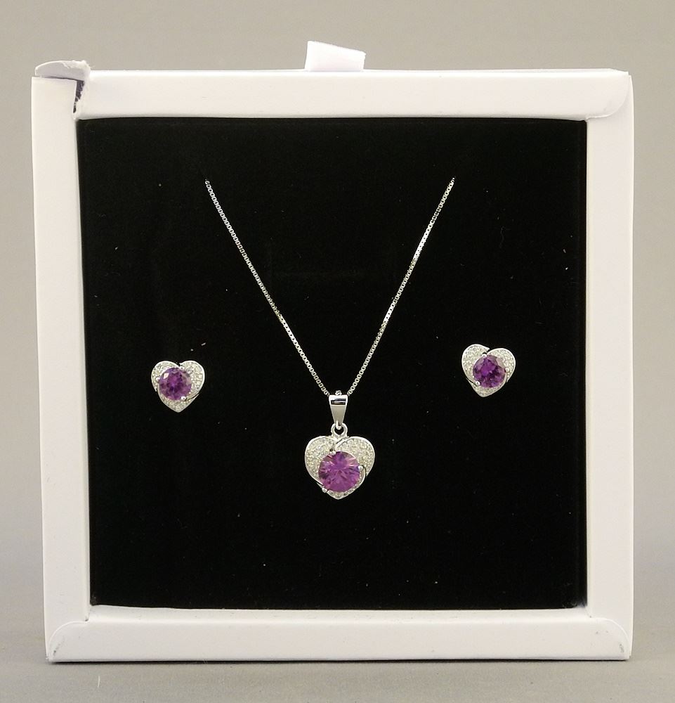 Sterling Silver with White Gold Overlay Lab Grown Purple Sapphire Heart Pendant & Earrings.