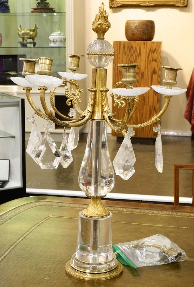 LOT 32 Pair of Ormolu & Rock Crystal Candelabra, 25" x 17" x 17" (as found). Estimate: $300 - $500 Auction Date: Tuesday, April 23 2024 at 4:00 PM