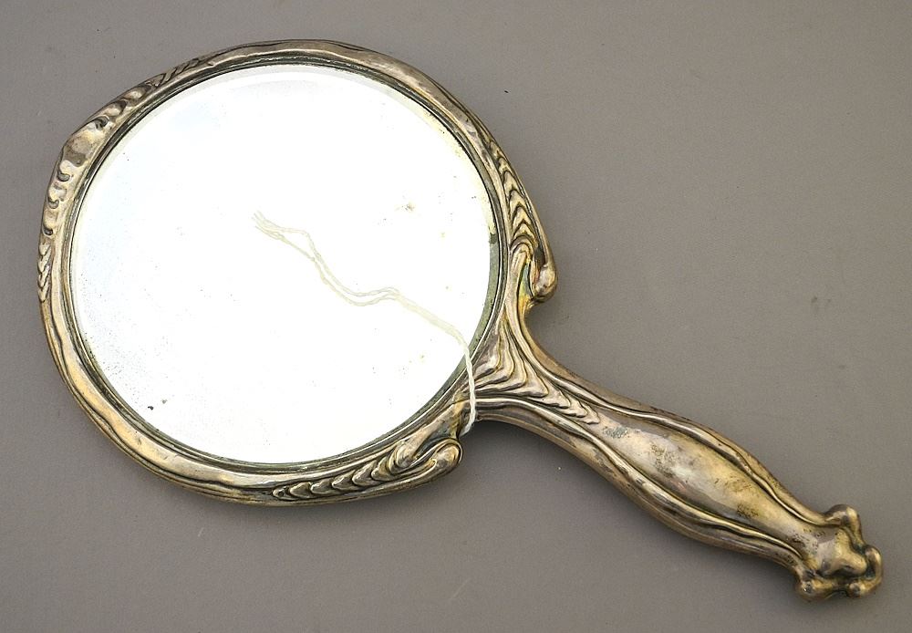 LOT 61 Art Nouveau Hallmarked Silver Hand Mirror, 11 5/8"H, TW 426 Grams. Estimate: $80 - $100 Auction Date: Tuesday, April 23 2024 at 4:00 PM