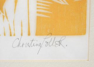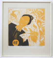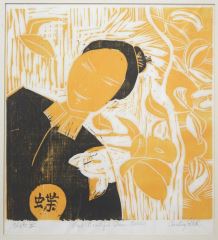 Block Print signed Christine Toller, 13 1/2" x 12 1/4", "Most Beautiful Queen Balkis".