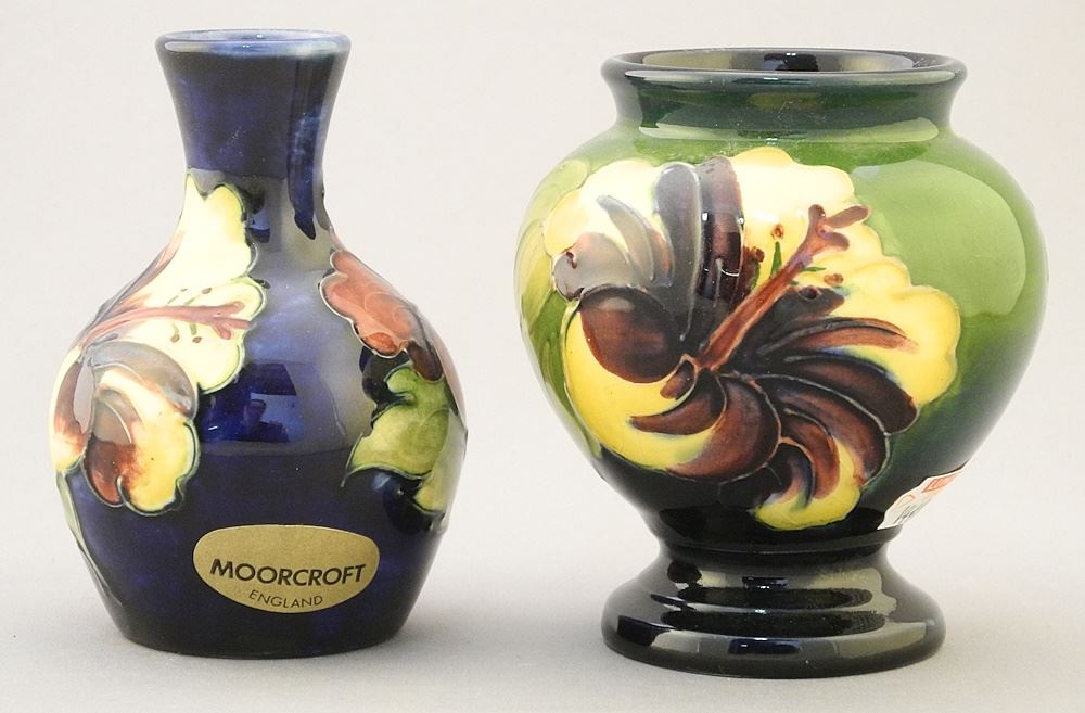 2 Moorcroft "Hibiscus " Vases, 3 5/8"h.