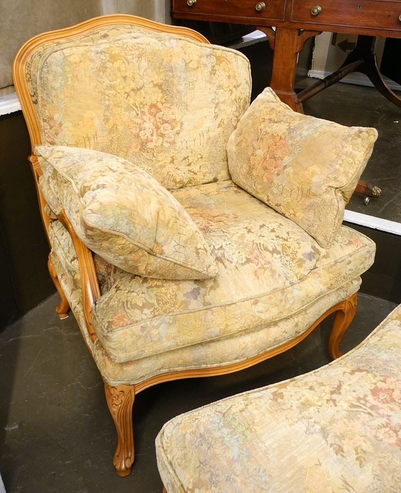 LOT 276 Fruitwood Bergere & Ottoman, 38"h x 56" x 32"w. Estimate: $100 - $200 Sold For: $120 Auction Date: Tuesday, July 30 2024 at 4:00 PM