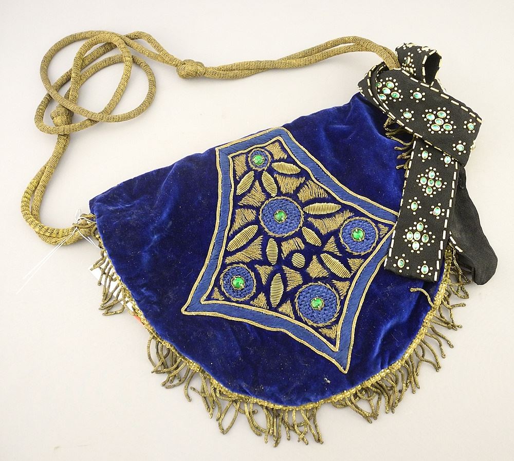 LOT 255 Handcrafted Blue Couched Gold Thread Embroidery Handbag & Paste Belt, 37"L. Estimate: $80 - $100 Auction Date: Tuesday, July 30 2024 at 4:00 PM