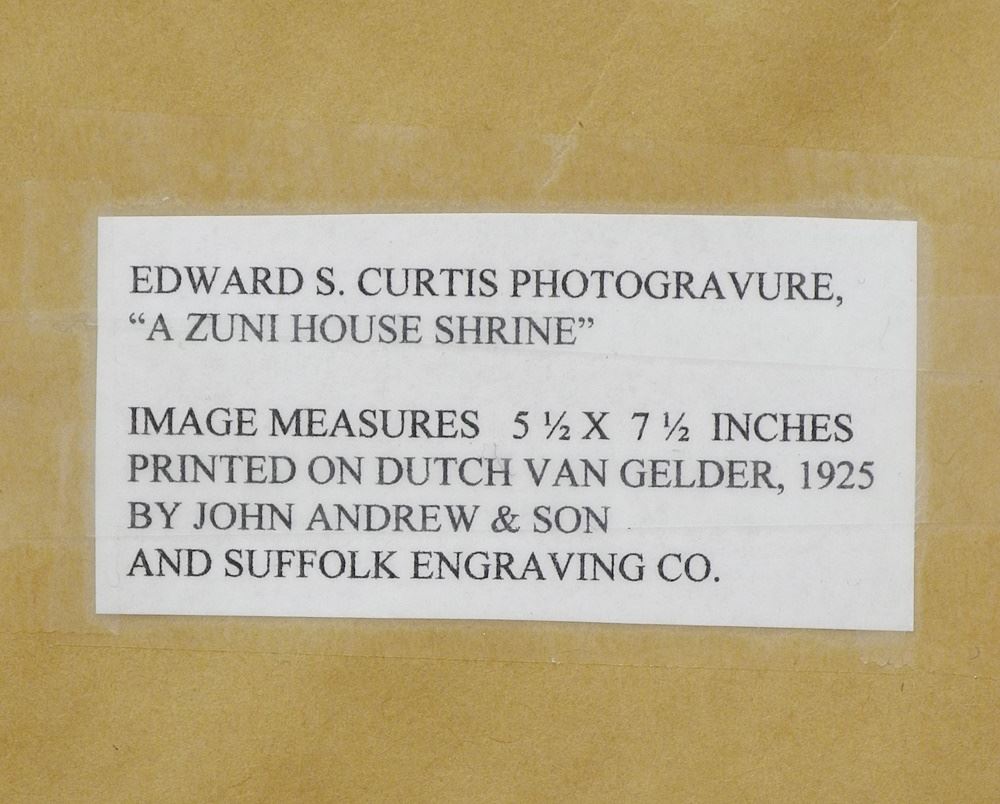 LOT 35 Edward S.Curtis "A Zuni House Shrine" Photogravure, 8 1/2" x 6", Copyright 1925. Estimate: $60 - $100 Sold For: $50 Auction Date: Tuesday, July 30 2024 at 4:00 PM