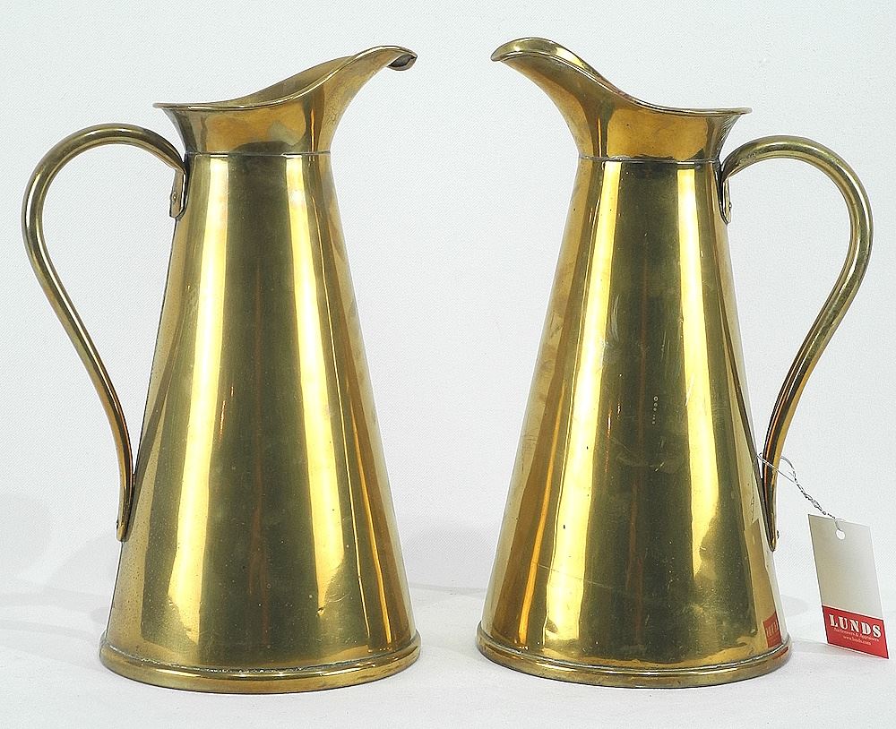 4 Brass & Copper Items: Pail (8 1/2" h) / 2 J,S&S Pitchers / Bird.