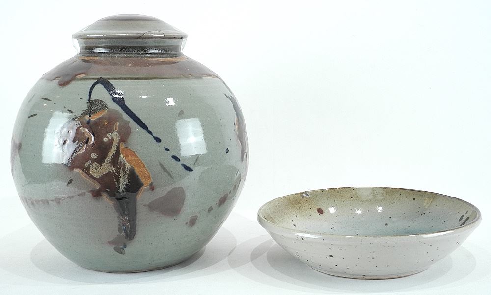 Porcelain Covered Jar (lid restored) & Bowl, 12" & 10 1/2" Diameter.