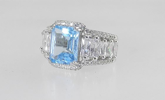 4 ct Emerald Cut Swiss Blue Topaz Ring, Size 6, Mounted in Sterling Silver with White Gold Ove