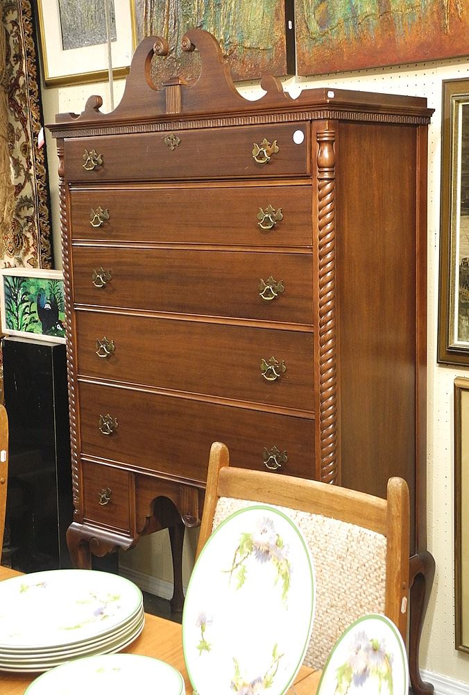 LOT 242 Malcolm Colonial Mahogany High Boy Dresser, 70 1/2"h. Estimate: $100 - $200 Sold For: $110 Auction Date: Tuesday, January 21 2025 at 4:00 PM