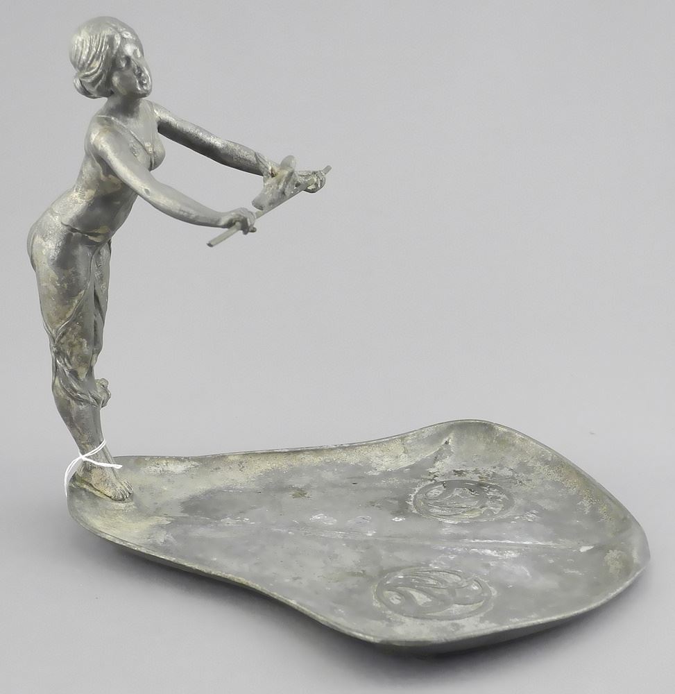 WMF "Balancing Lady" Pewter Dish Model 247, 7 1/4" x 8 1/4" x 7 5/8" (condition noted).