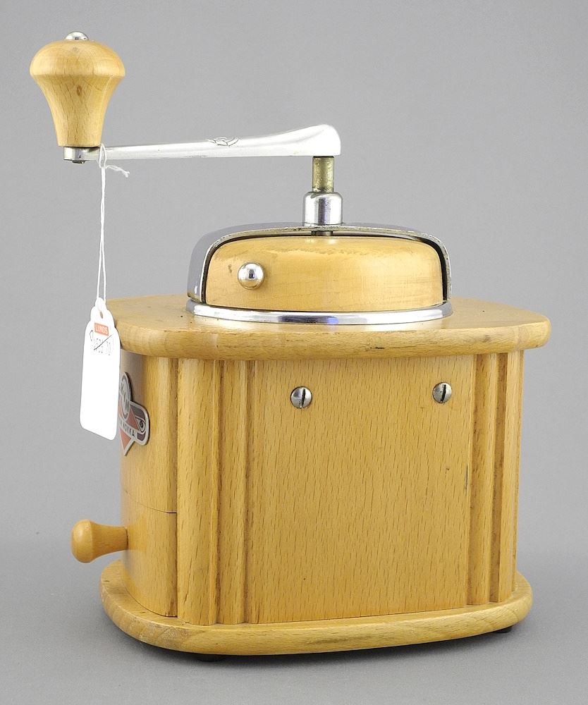 LOT 129 C.1955 KYM MOKKA Beechwood Coffee Grinder, 8 1/4"h. Estimate: $50 - $70 Sold For: $80 Auction Date: Tuesday, March 18 2025 at 4:00 PM