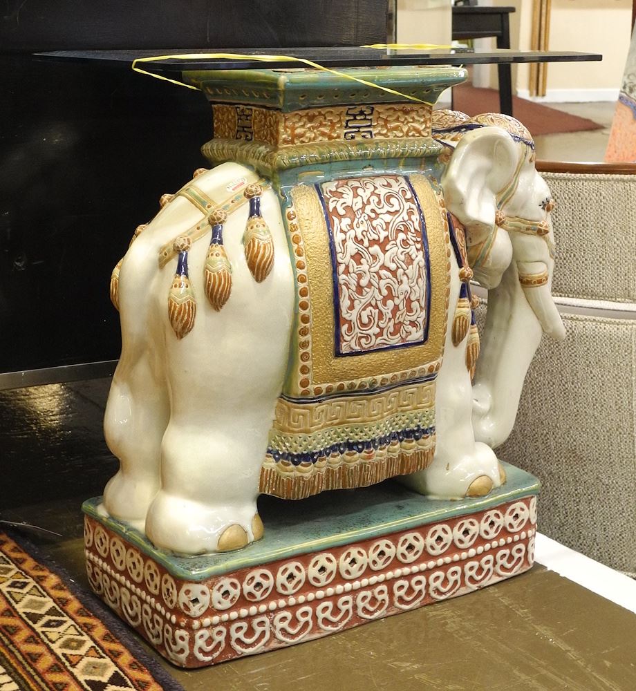 LOT 207 Chinese Ceramic Caparisoned Elephant with Glass Top, 21 1/2"h. Estimate: $100 - $150 Sold For: $250 Auction Date: Tuesday, March 18 2025 at 4:00 PM