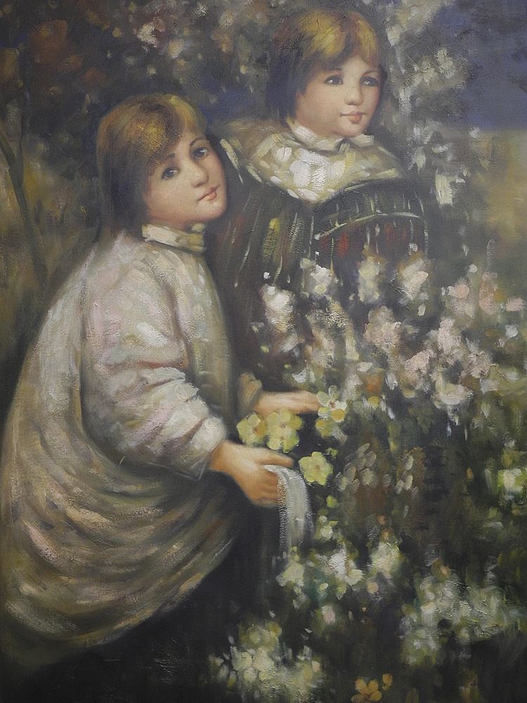 LOT 153 Unsigned Oil on Canvas, 64 1/2 x 34 1/2", "Two Girls in a Garden Setting ". Estimate: $200 - $300 Auction Date: Tuesday, March 18 2025 at 4:00 PM