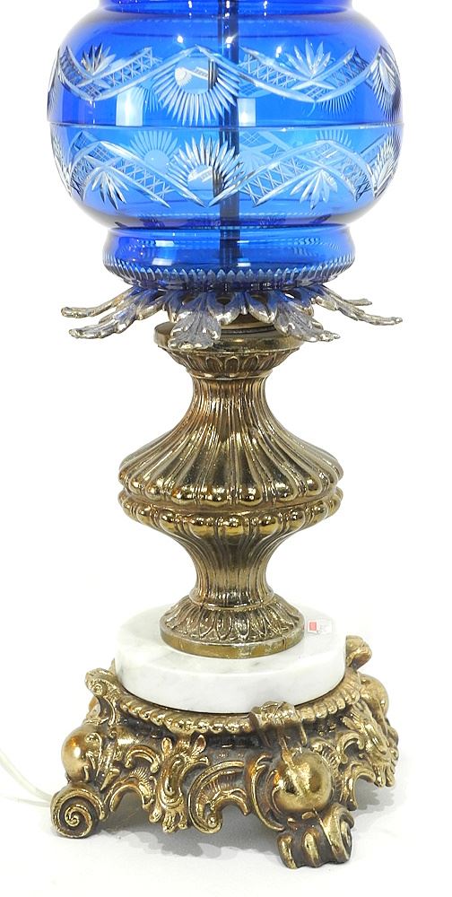 LOT 203 Bohemian Cobalt Overlay Glass & Brass Table Lamp, 23 1/2"h. Estimate: $80 - $120 Sold For: $60 Auction Date: Tuesday, March 18 2025 at 4:00 PM