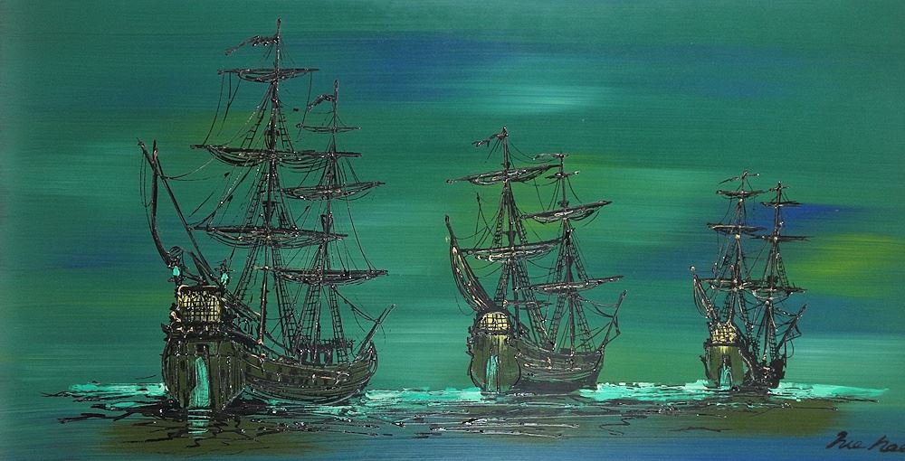 LOT 87 Oil on Board signed *** Hall, 23 1/2 x 47 1/2", "Three Galleons". Estimate: $50 - $100 Sold For: $60 Auction Date: Tuesday, March 18 2025 at 4:00 PM