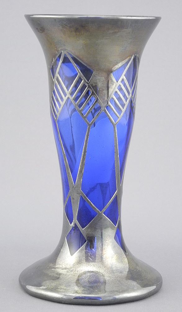 LOT 73 Art Deco Silver Overlay Blue Glass Vase, 5 7/8"h. Estimate: $50 - $60 Sold For: $140 Auction Date: Tuesday, May 13 2025 at 4:00 PM