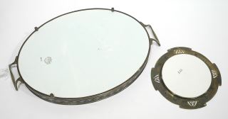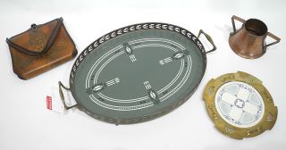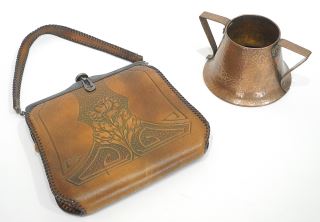 LOT 138 Collection of Art Nouveau Items: Copper Vase/Leather Purse/2 Brass Trays (1 missing foot). Estimate: $60 - $100 Sold For: $60 Auction Date: Tuesday, May 13 2025 at 4:00 PM