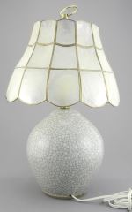 LOT 263 Craquelure Stoneware Table Lamp Impressed JA with Shell Shade, TH 17". Estimate: $50 - $60 Sold For: $15 Auction Date: Tuesday, May 13 2025 at 4:00 PM