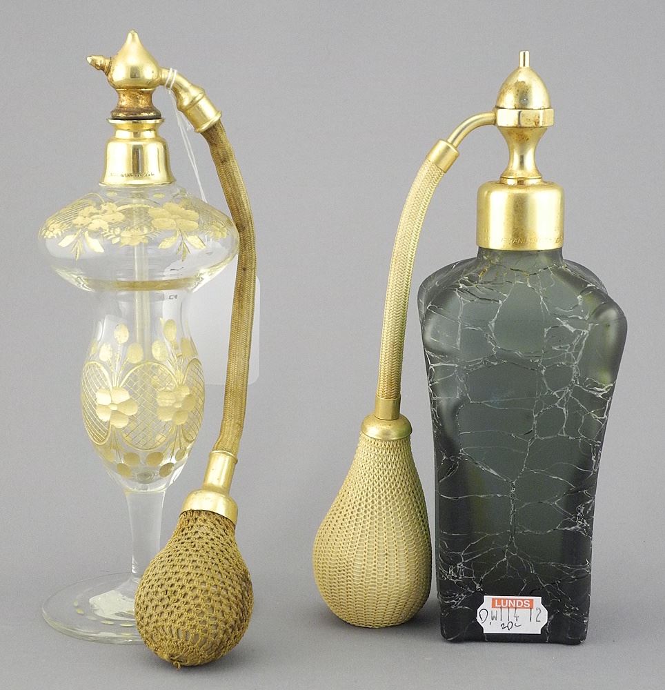Two Atomizers: Gilt Etched & Crackle Glass, Approximately 7 1/8"h.