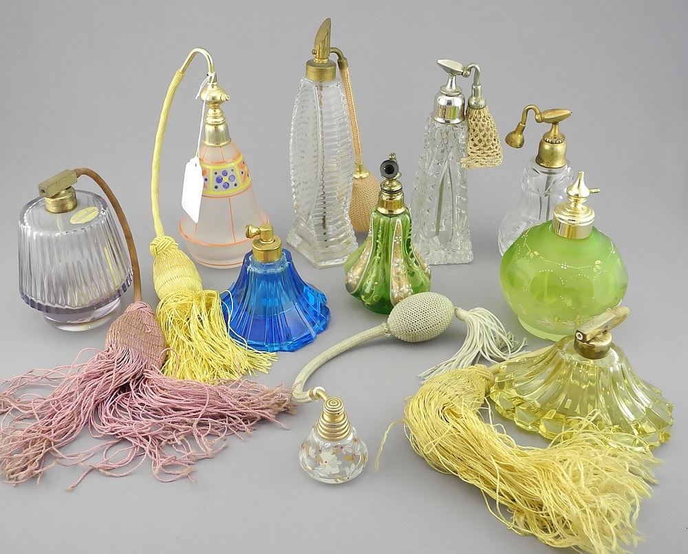LOT 218 Ten Various Glass & Crystal Atomizers, 2 - 7 1/4"h. Estimate: $100 - $200 Sold For: $60 Auction Date: Tuesday, May 13 2025 at 4:00 PM