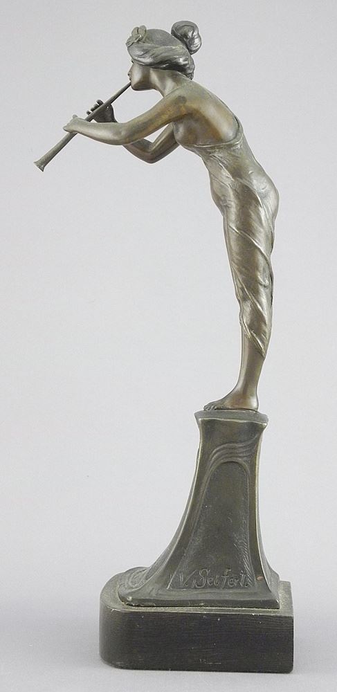 LOT 220 Bronze Figure signed V. (Victor) Seifert, 11 1/4"h, "Girl with Flute" , C.1910. Estimate: $200 - $300 Sold For: $375 Auction Date: Tuesday, May 13 2025 at 4:00 PM