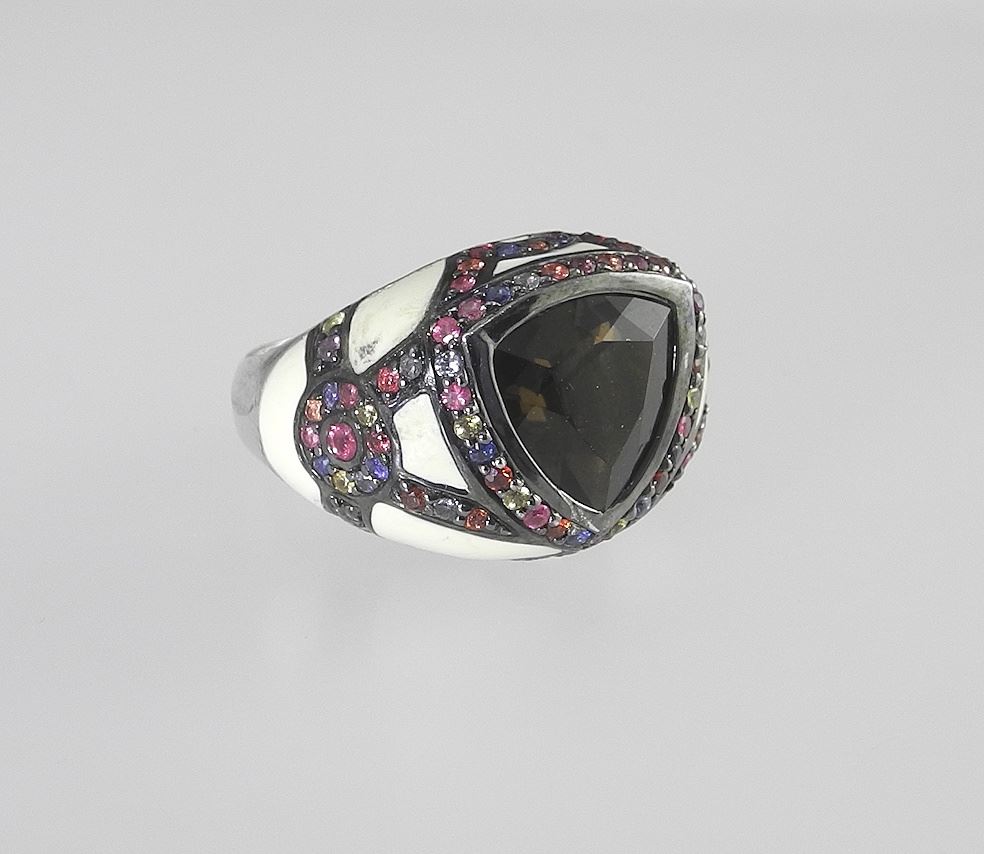 Effy Sterling (marked 925) Silver Smokey Quartz, Sapphire & Enamel Ring, Size 9, 6.7g.