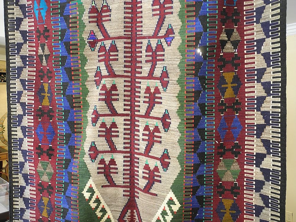 LOT 36 Flatweave Kilim, Blue/Green/Magenta, Approximately 91' x 56". Estimate: $80 - $120 Sold For: $150 Auction Date: Tuesday, May 13 2025 at 4:00 PM