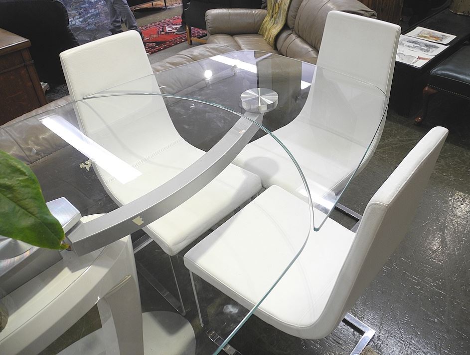 LOT 237 Calligaris Contemporary Glass Leather & Chrome Dining Room Suite. Estimate: $400 - $600 Sold For: $1,200 Auction Date: Tuesday, May 13 2025 at 4:00 PM