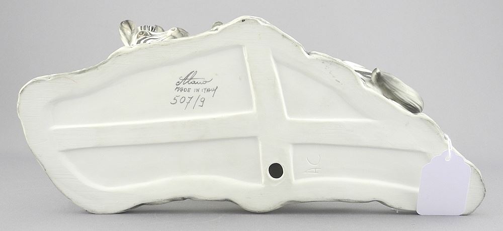 Italian Porcelain Zebra Sculpture, signed, 8 1/8 x 11 1/2 x 5".