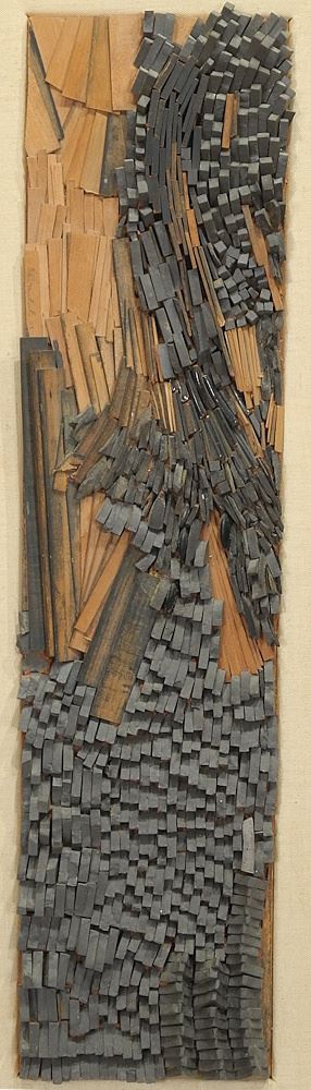 LOT 69 Mixed Media with Wood & Stone signed Glen Michaels'63, 23 x 5 7/8", "Tessellated Landscape". Estimate: $150 - $250 Sold For: $225 Auction Date: Tuesday, September 16 2025 at 4:00 PM