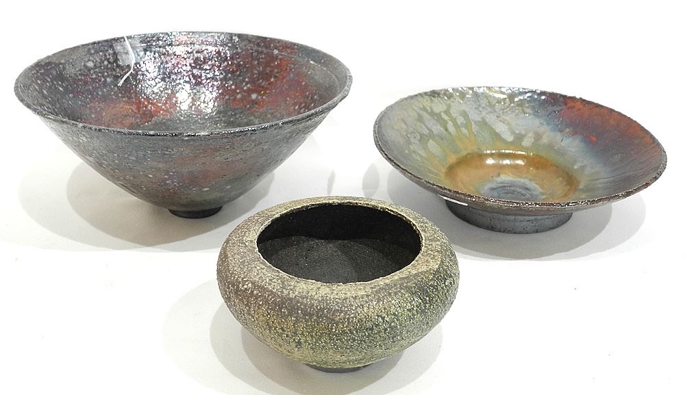 Three Raku Bowls signed Richard (Mosselman), 8 1/2 & 9 1/4" Diameter