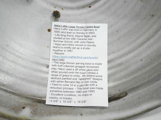 LOT 154 Stoneware Bowl with Impressed Mark of Heinz Laffin, 5 1/2 x 16 3/4" Diameter. Estimate: $100 - $150 Sold For: $110 Auction Date: Tuesday, September 16 2025 at 4:00 PM