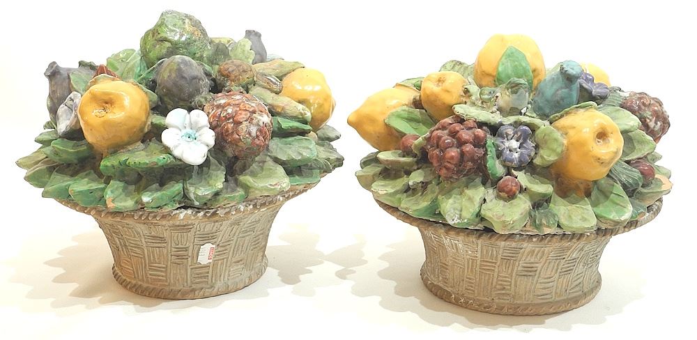 LOT 290 Pair of Italian Glazed Pottery Fruit Baskets, 8 1/2 x 10 1/2" Diam. (chipping noted). Estimate: $50 - $100 Sold For: $25 Auction Date: Tuesday, September 16 2025 at 4:00 PM