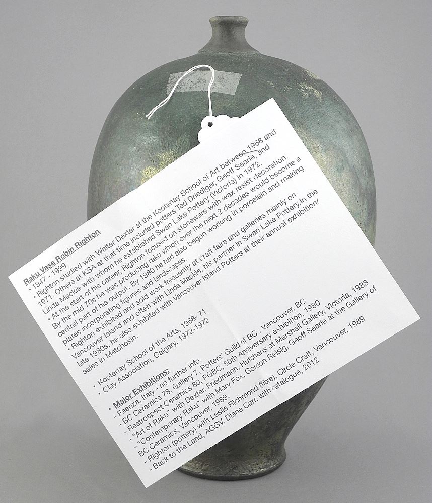 Raku Vase signed (Robin) Righton, 10 1/2"h.
