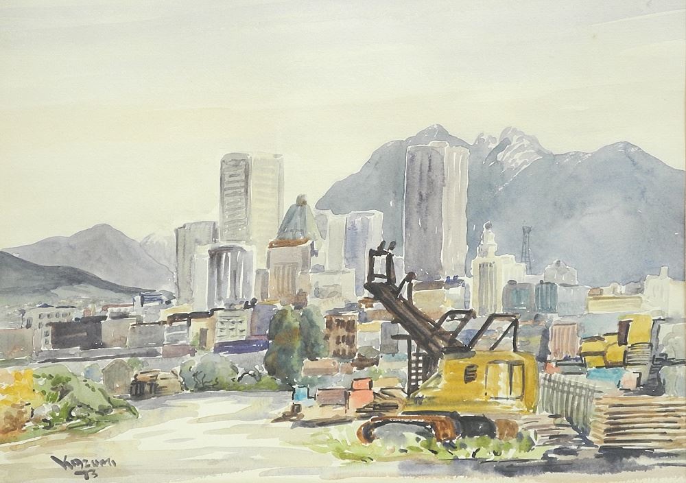 LOT 56 Watercolour signed Kazumi (Kawaguchi)'73, 9 5/8 x 13 3/8", "City From False Creek". Estimate: $50 - $100 Sold For: $10 Auction Date: Tuesday, March 24 2026 at 4:00 PM