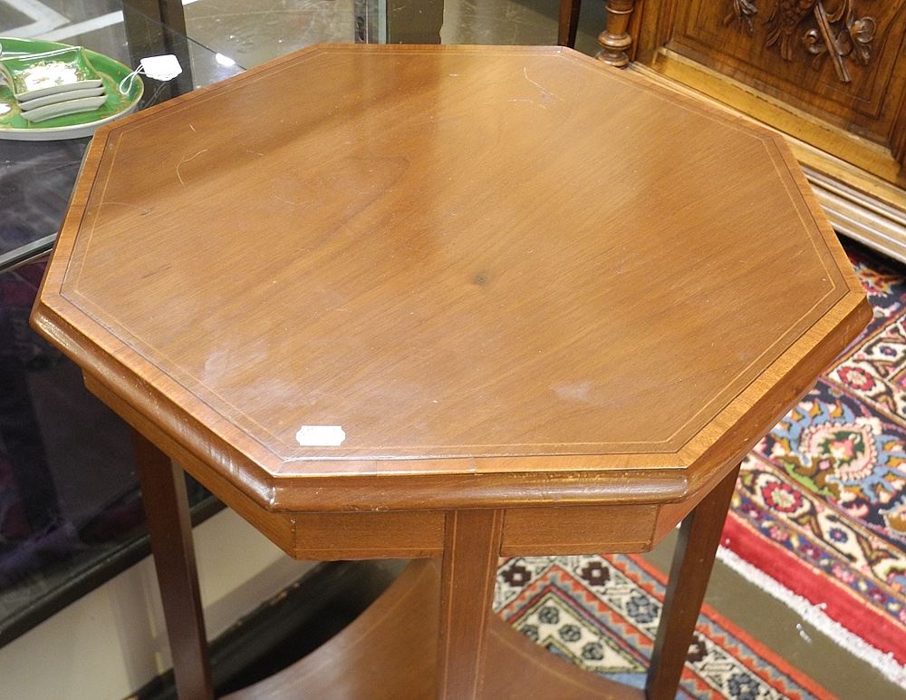 LOT 136 Banded Mahogany Hexagonal Side Table , 28 3/8"h. Estimate: $50 - $100 Sold For: $25 Auction Date: Tuesday, March 24 2026 at 4:00 PM