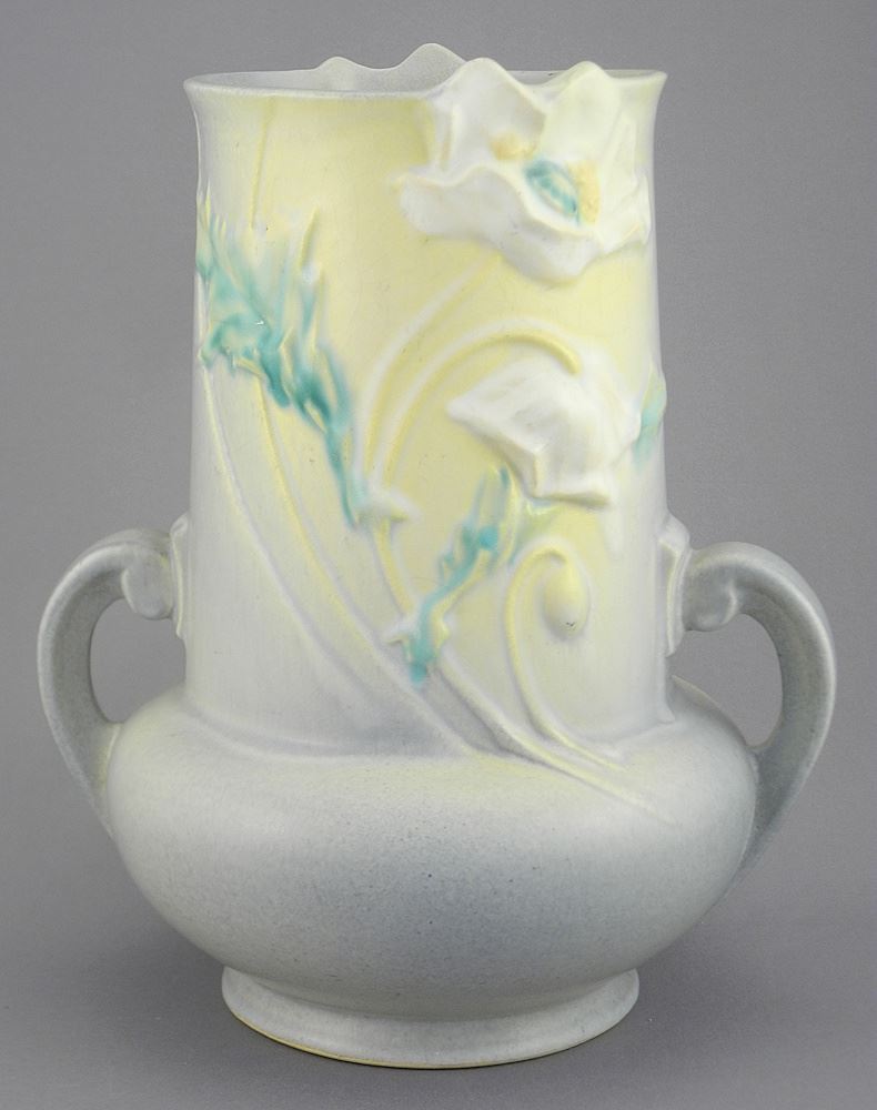LOT 143 Roseville "Poppy" Handled Vase, 9 1/2"h. Estimate: $60 - $100 Sold For: $80 Auction Date: Tuesday, March 24 2026 at 4:00 PM