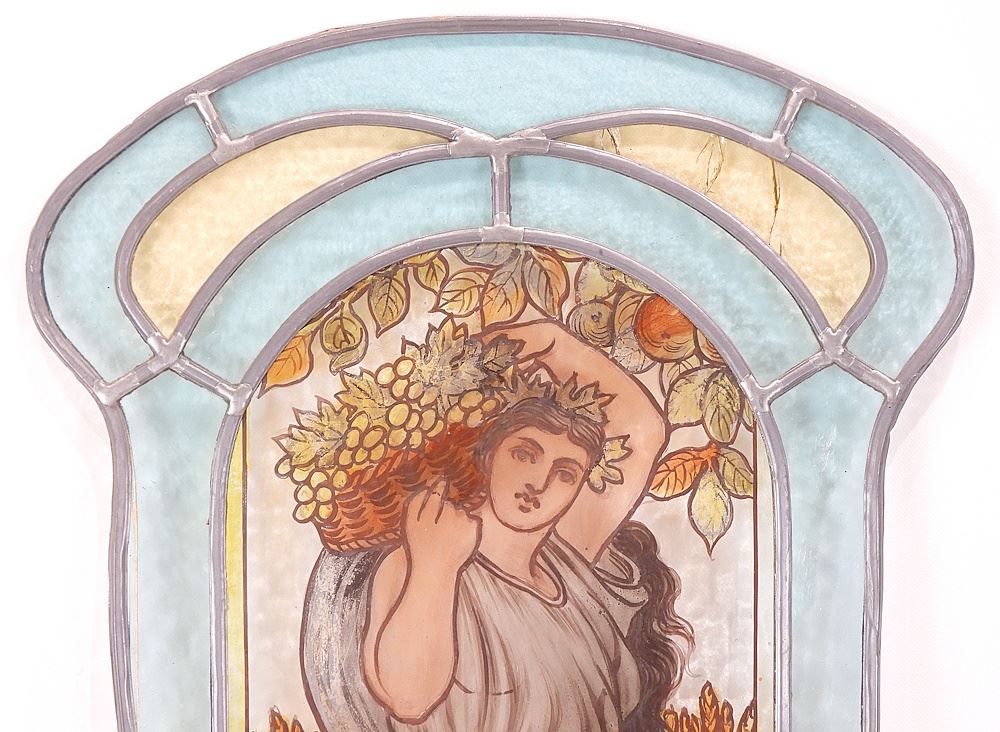 LOT 261 Alphonse Mucha Style "Autumn" Leaded Glass Art Nouveau Window Panel, 22 1/4"h (cracks noted). Estimate: $100 - $200 Sold For: $90 Auction Date: Tuesday, March 24 2026 at 4:00 PM