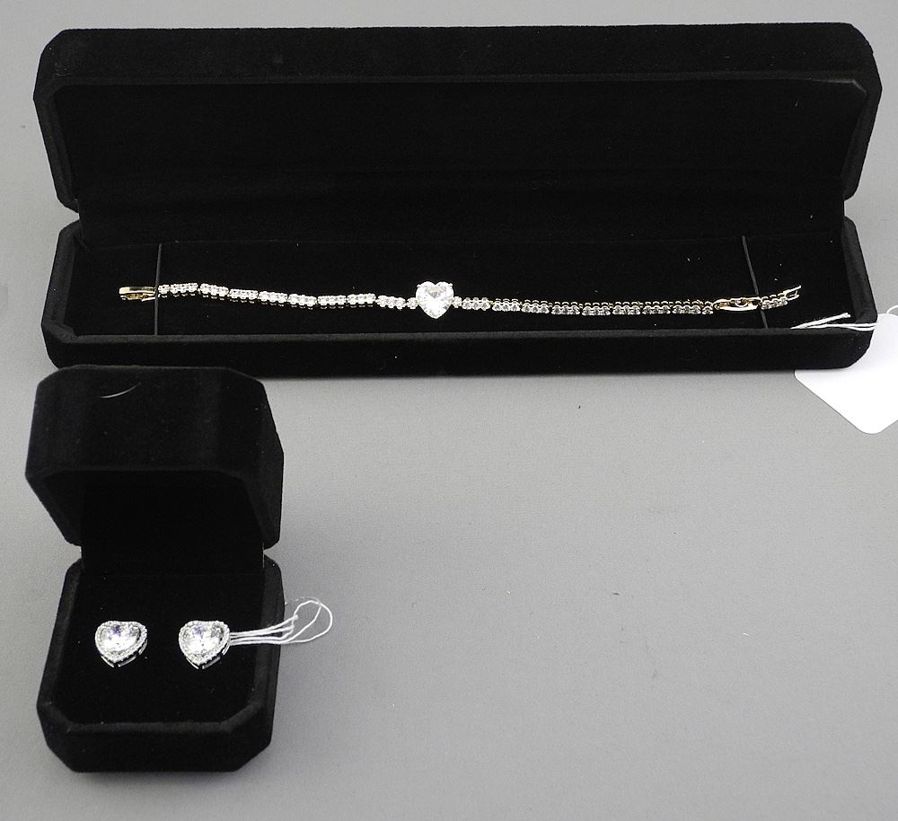 18K Gold Plated Heart Cut CZ Bracelet, 6 3/4 - 7 1/2"L & Earrings