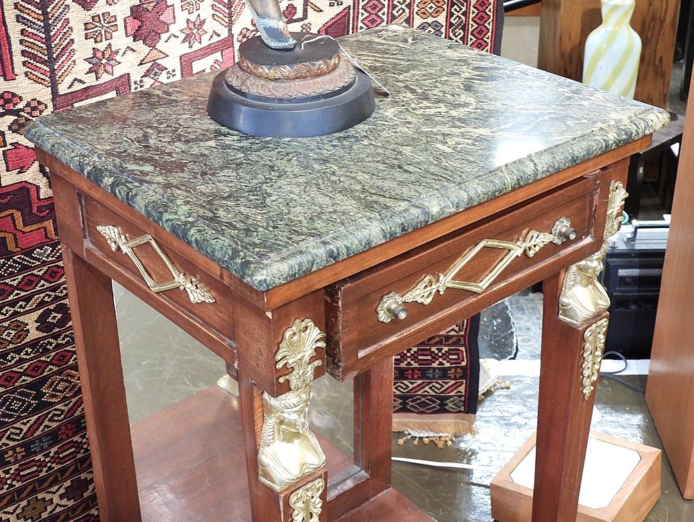 LOT 27 Pair of Reproduction French Empire Style Marble Top Side Tables, 34 1/4"h. Estimate: $200 - $400 Sold For: $200 Auction Date: Tuesday, March 24 2026 at 4:00 PM