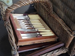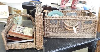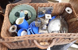 LOT 154 Antique Wicker Picnic Basket with Blue Adderley's Pottery/Silver Plate /Hod. Estimate: $60 - $100 Sold For: $35 Auction Date: Tuesday, March 24 2026 at 4:00 PM