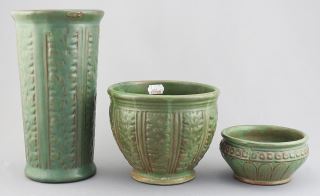 LOT 282 Three Weller Pottery Items: 2 Orris Oak, 2 1/8 - 7 7/8"h. Estimate: $80 - $120 Auction Date: Tuesday, March 24 2026 at 4:00 PM
