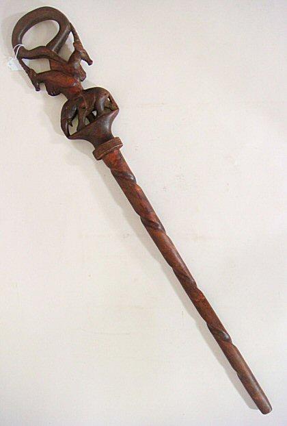 African carved wooden walking stick with two antelope and elephant, length 36 in.