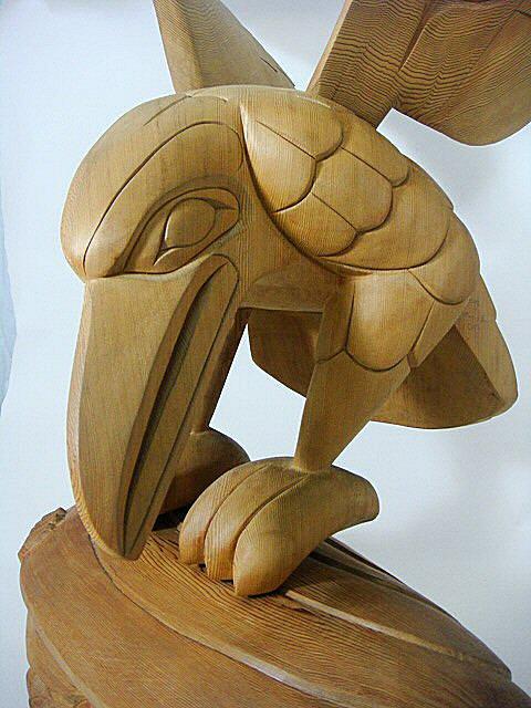 Native three piece carving by Doug LaFortune, "Raven and the First Man".