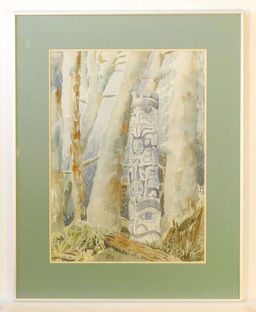 Watercolour signed J.M.Sim, 17 1/2" x 13","Totem in Forest".